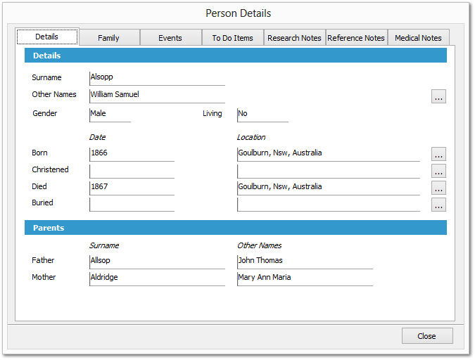 This layout and functionality of the PERSON VIEW is dependant on the family history software which has been linked to Genota. Shown is the display when linked to a Legacy Family Tree (Legacy) family file. Other software packages will result in differently configured layouts.