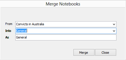 Select from the drop down lists the notebook to be removed [FROM] and the notebook into which the FROM notebook will be merged [INTO]